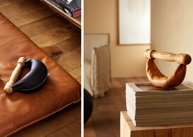 Fresno y cuero se mezclan para crear esta maravilla que ergonómica no sé si será pero cómoda de usar, desde luego no parece mucho. Si incorporan un tapón, tenemos una bota perfecta para rellenarlas del vino del pueblo. Imaginaos con una pila de estas pesas en tu salón.