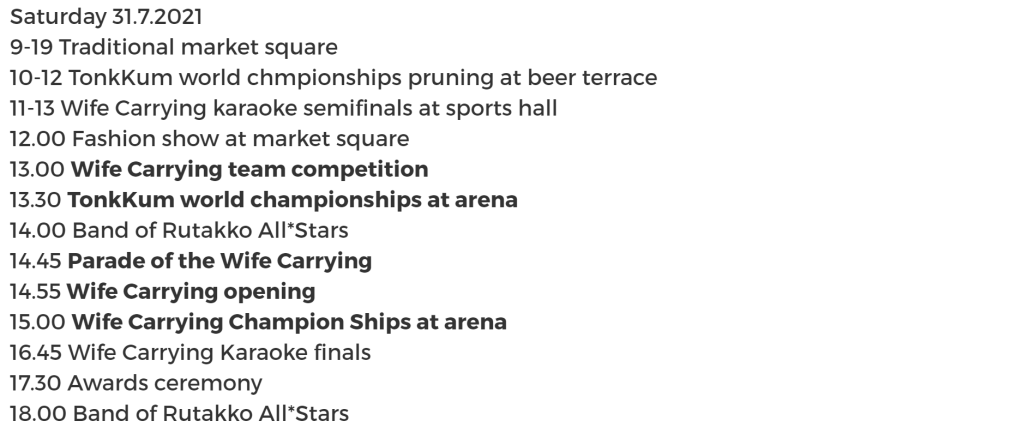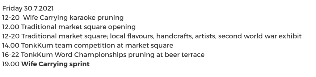 Tras cancelar el evento del año pasado por la pandemia, la fecha para el próximo campeonato mundo de cargar con la pareja (WIFE CARRYING WORLD CHAMPIONSHIP o EUKONKANNON) será el 30 y 31 de julio. Los finlandeses igual te montan un grupo de death metal que te montan un finde loco de karaoke y carreras llevando a tu pareja a cuesta.