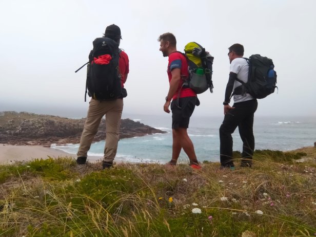Nosotros hicimos sólo las últimas 5 etapas de O Camiño dos Faros, es decir, en vez de empezar en Malpica, nos unimos al camino en Laxe. En vez de 200km, unos 125. Y no sé si deciros que se me han quedado cortos, porque a ver, para la forma en la que íbamos, demasiado bien ha ido. Desde luego, sí que se me pasaron más o menos rápido. Los pies respondieron (sólo una ampolla) y no tuve mayor problema que molestias los dos últimos días en la cintilla iliotibial (que tampoco es muy raro). 3 señores mayores y un camino al borde de los acantilados… ¿Qué podía salir mal?