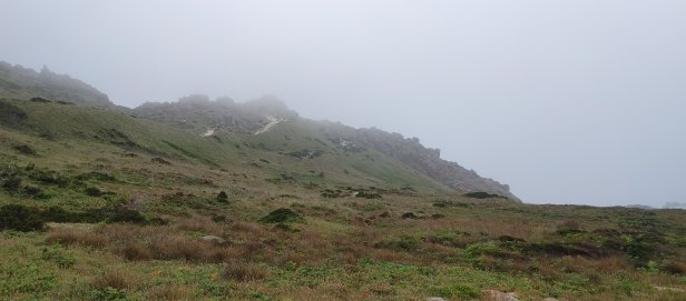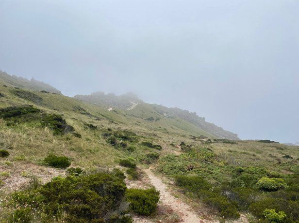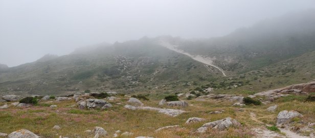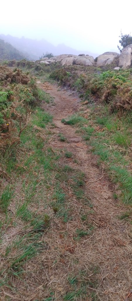 Pues la etapa se las trae (y pudo ser peor). Los 25,3 km en realidad se nos convirtieron en 26,34 km y un desnivel positivo de 1.035 metros. La risa tonta te entra nada más salir de Muxia y llegar al Parador, una primera subidita con desniveles de más de un 40% (según el Garmin). Pero sí, pudo ser peor porque retrasamos la salida confiando en la predicción meteorológica y acertamos, empezar mojados desde el principio después del día anterior habría sido una matada.