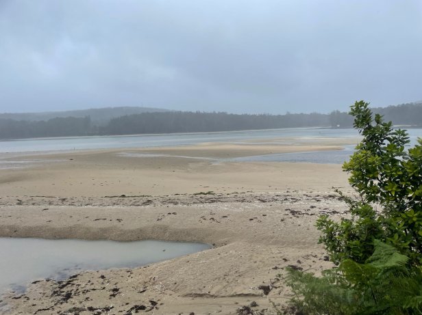 Los paisajes bajo la lluvia parece que por algún momento te teletransporten a Escocia, están bien pa un rato, pero chuparte más de 7 horas de lluvia, pues como que no. Eso sí, para que nos lloviera, el mejor día era este. Es el día que más pueblos se pasan y el que más opciones de hacer un alto en el camino tuvimos. Además, era la etapa más sencilla en cuanto a dificultad técnica. Bueno, ojo a la desembocadura del río por un camino por pasarelas de madera que resbalaba lo suyo.