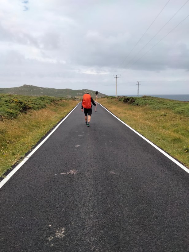 Probablemente la etapa con más terreno por pista de todo el recorrido. Nos salieron 24,26 km y 500 m de desnivel positivo. El Faro Vilán siempre al fondo, cada vez más cerca, pero llega a convertirse en un coñazo la sensación de parecer que por mucha pista que vas metiendo, siempre queda una curva que te aleja de un avance más rápido.